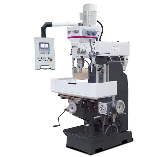 Heavy, solid design made of high-quality, vibration-absorbing gray cast iron Oil bath gearbox with ground, hardened gear wheels Coolant device Halogen machine lamp with focused beam Solid and generously dimensioned cross table, precisely surface-machined with T-slots and adjustable gibs Milling head can be tilted ± 45 Right/left rotation X-axis moves either with the handwheel or via the table feed device Automatic limit stop of the X-axis Height-adjustable protective screen with microswitch, against flying chips and parts, for maximum protection of the user
